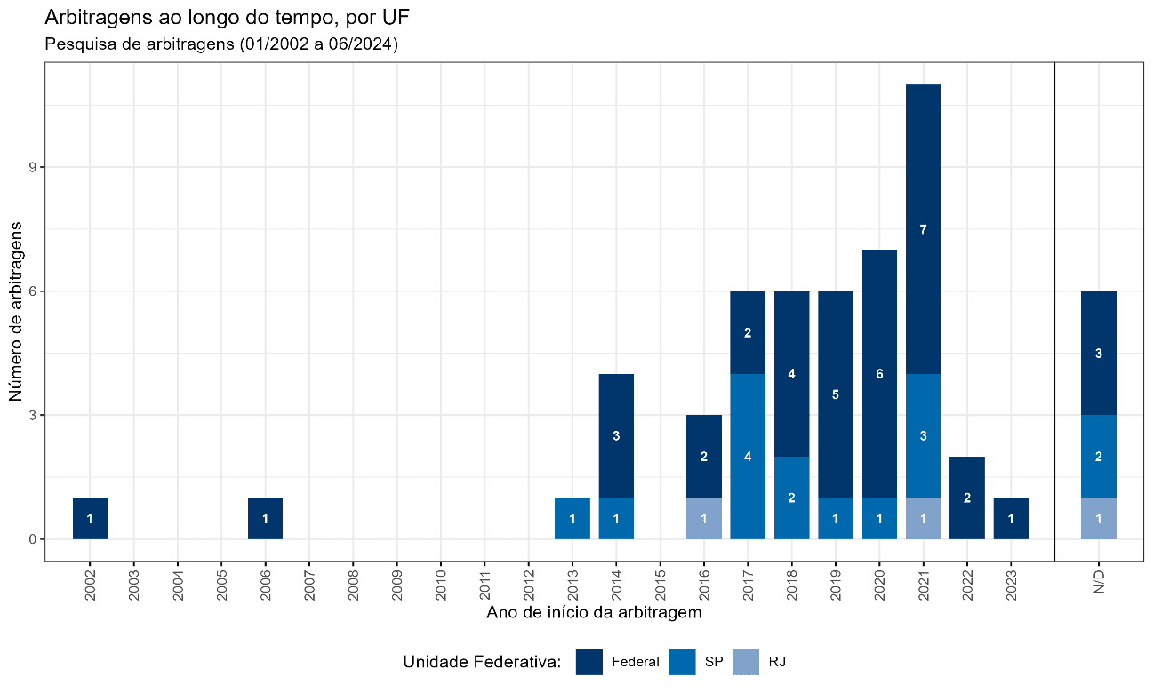 [1] Há um grupo de 6 arbitragens classificadas como “ND” (Não Determinado), cuja data de início não pôde ser identificada devido a restrições de sigilo. Esse conjunto inclui 3 arbitragens federais, 2 em São Paulo e 1 no Rio de Janeiro.